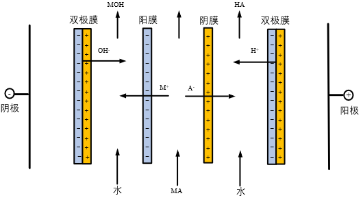 包括三隔室双极膜电渗析器和二隔室双极膜电渗析器两种;三隔室双极膜电渗析器适用于将无机盐转化为对应酸和碱,膜对由双极膜、阳离子交换膜和阴离子交换膜组成,包含盐室、酸室和碱室;二隔室双极膜电渗析器适用于将有机酸盐转化为有机酸和碱或将有机碱盐转化为有机碱和酸,膜对由双极膜和阳离子交换膜(包含料室和碱室)或双极膜和阴离子交换膜(包含料室和酸室)。