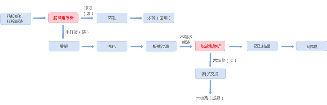 粘胶纤维生产过程中产生大量压榨废碱液,以前转移到污水处理厂用酸中和,不仅产生大量固废,而且造成资源浪费。采用均相膜电渗析装置,压榨碱液经电渗析脱碱回用,脱碱后的半纤经酸解、电渗析脱盐净化后生产木糖,该工艺是工业废弃物资源化利用并实现废水零排放的典型案例。该项目已连续运行两年,全年可实现20万吨高含量半纤维素碱法浆处理回用,对传统产业工艺绿色化改造具有重要意义。