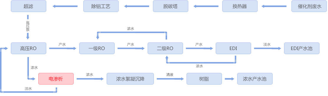 炼油催化剂生产过程中产生3%左右的硝酸铵废水,采用均相膜电渗析装置进行浓缩淡化,浓水硝酸铵浓度达到20%后进入蒸发系统,电渗析淡水经反渗透处理后回用,实现含硝酸铵废水资源化利用及零排放。